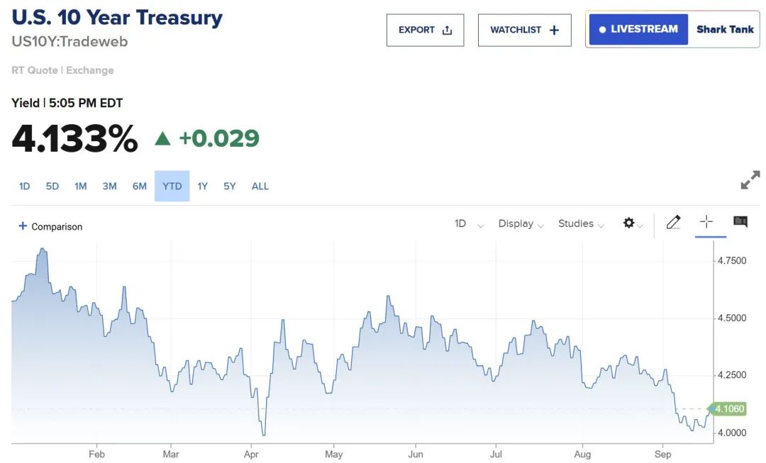 利率决议公布后,COMEX黄金期货价格短线美元/盎司,创下历史新高,随后迅速回落。截至发稿,COMEX黄金期货价格为3719.4美元/盎司。美元指数一度跌至自2022年2月以来的最低点96.224,但在鲍威尔讲话后开始反弹,截至发稿,美元指数为97.66。当前,十年期美债收益率较9月17日收盘价上涨1.5%至4.133%,两年期美债收益率较9月17日收盘价波动不大,现为3.574%。