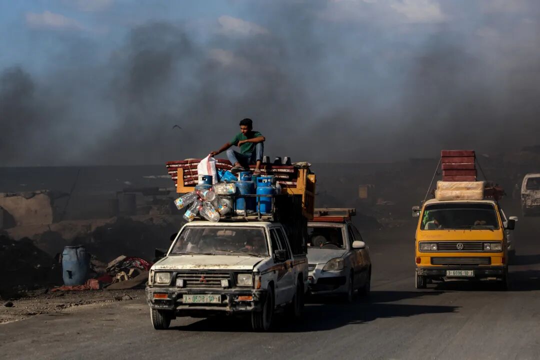 9月9日,巴勒斯坦民众携带物品乘车从加沙地带北部向南部撤离。图片来源:新华社发(里泽克·阿卜杜勒贾瓦德摄)